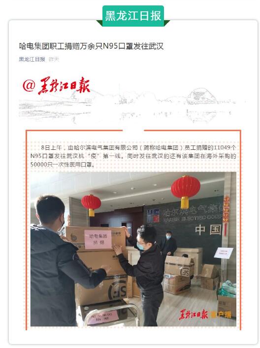 新型冠狀病毒感染肺炎疫情發(fā)生后,哈電集團積極響應國務院國資委號召,在向疫情防控一線捐贈1500萬元善款之后,其防護物資捐贈工作隨即啟動。2月8日,哈電集團11000余只醫(yī)用防護口罩急速運往武漢一線疫區(qū),“哈電集團捐贈物資,馳援抗疫一線”這一愛心舉措再次得到中央電視臺、新華社、中央廣電總臺、《國資報告》《科技日報》《中國工業(yè)報》《能源雜志》《黑龍江日報》、黑龍江省電視臺、哈爾濱市電視臺等多家媒體的廣泛關注和報道。下面,小編帶大家一起來看看其中部分報道。