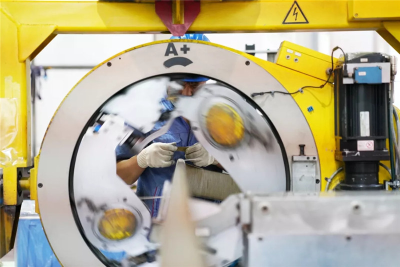 ↑在哈電汽輪機(jī)廠房?jī)?nèi),工人在進(jìn)行生產(chǎn)作業(yè)(新華社記者王建威9月3日攝)。